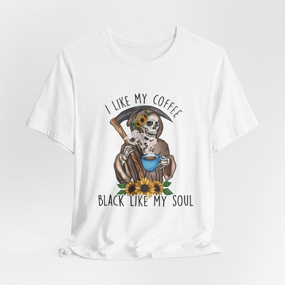 Trendy Artistic T-Shirt Grim reaper I Like My Coffee Black Like My Soul Art Tee