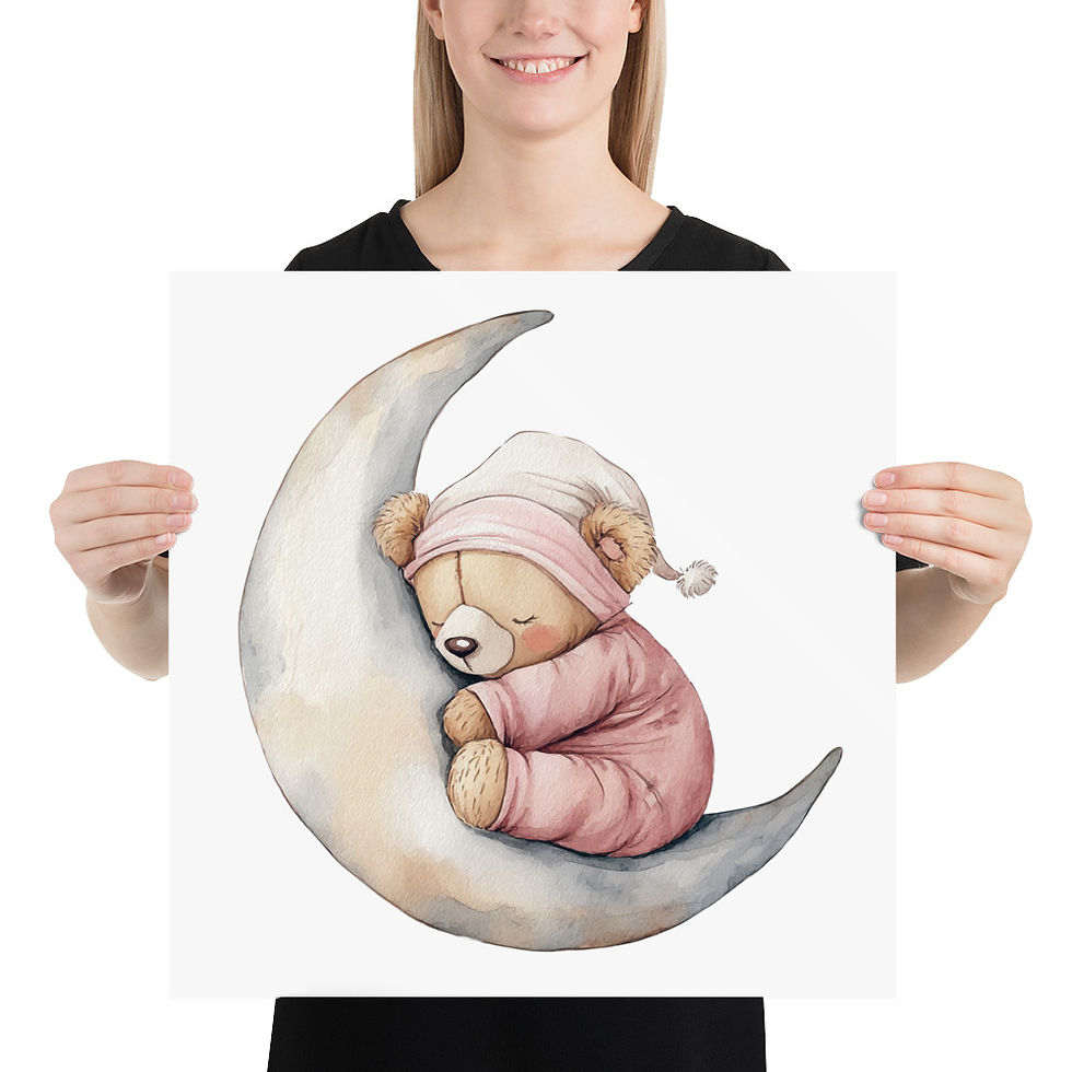 Children's Nursery Decor, Sleeping Bedtime Bear on Moon Watercolor Art Print