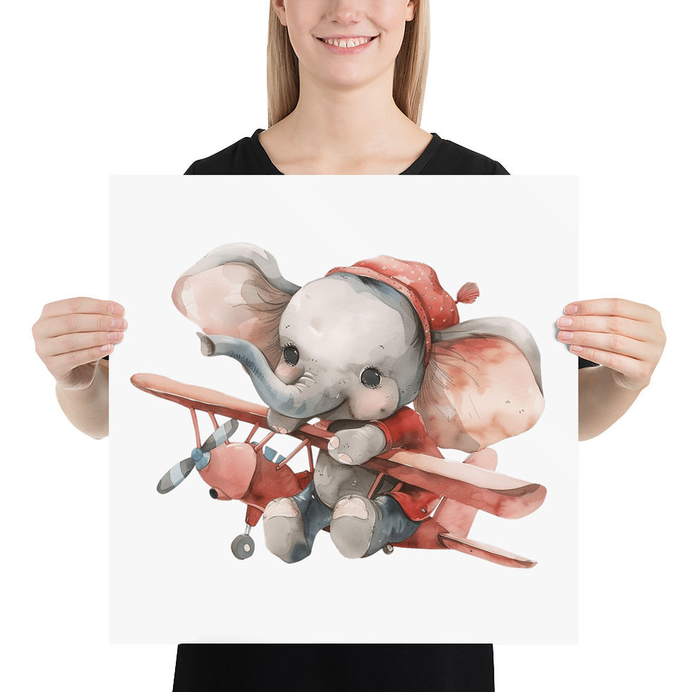 Children's Nursery Decor, Baby Elephant in Airplane Watercolor Art Print